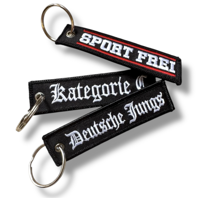 Das Set besteht aus 3Schlüsselanhängern mit Deutsche Jungs, Kategorie C und dem Sport-frei Schriftzug beidseitig gestickt.